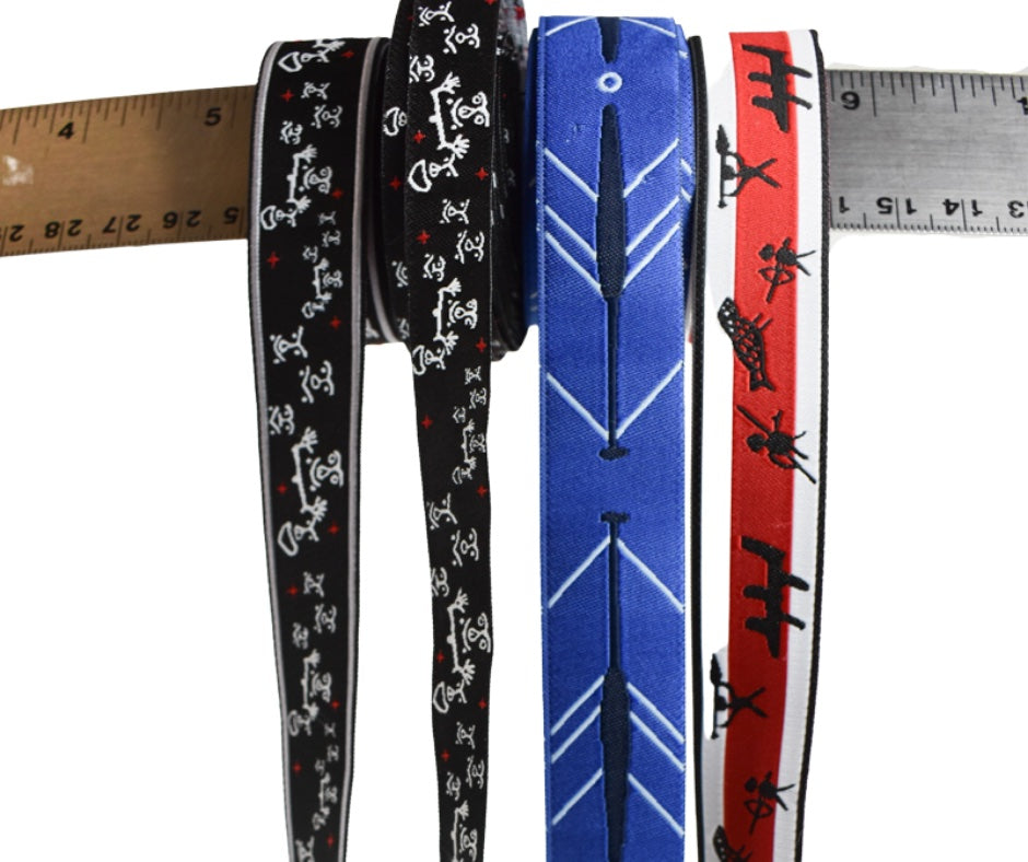 High-quality brocade fabric ribbon for all of your projects. This ribbon is narrower than our other options, for those projects requiring a thinner trim. Designed by the Alutiiq Museum with a black background and images of Alutiiq petroglyphs. Price is per yard and ribbon is .5" (a half-inch) wide.