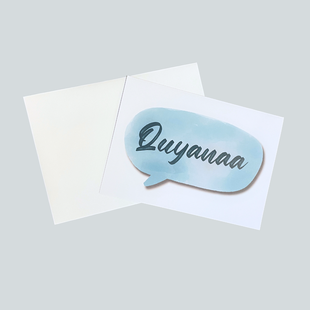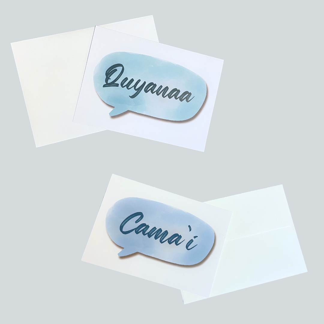 Five cards and envelopes in each pack, this is an easy way to let your loved ones know that you're thinking of them. "Hello" with the Cama'i cards or "Thank you" with the Quyanaa cards. The inside is blank, allowing you to customize the messages inside.