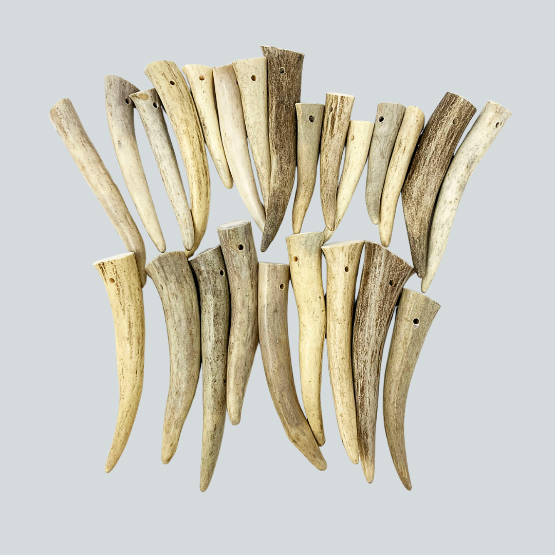 Antler tips for your craft project. These deer antler tips are each 4-5 inches long, and come pre-drilled with a single hole at the top. They are USA-origin, naturally shed antlers. Selection is random, specific tips cannot be selected.