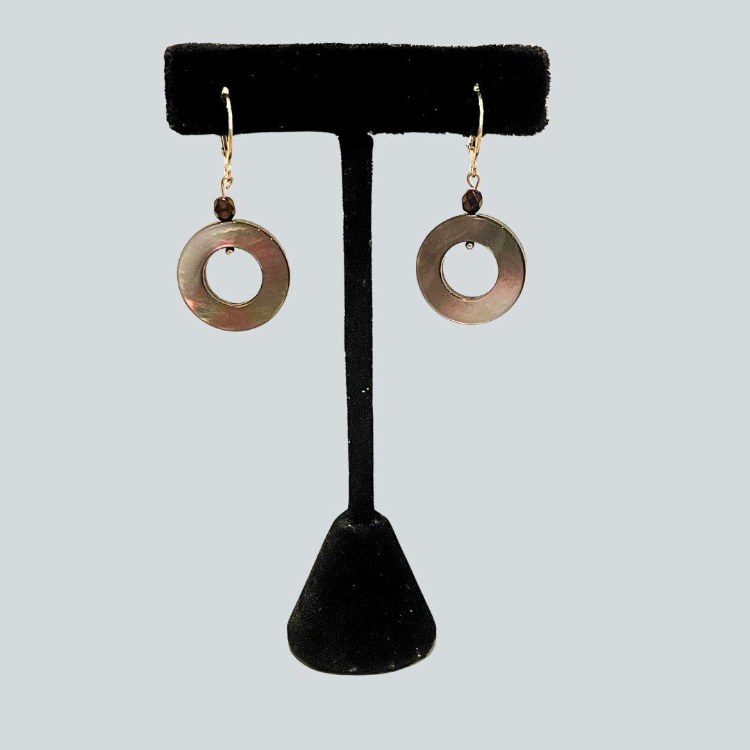 Made by Alutiiq Seal Artist Cassey Rowland hang approximately 1.5" long. The blacklip pearl earrings are mildly iridescent with a variety of colors showing in the light. These earrings are lightweight and perfect for any gift.