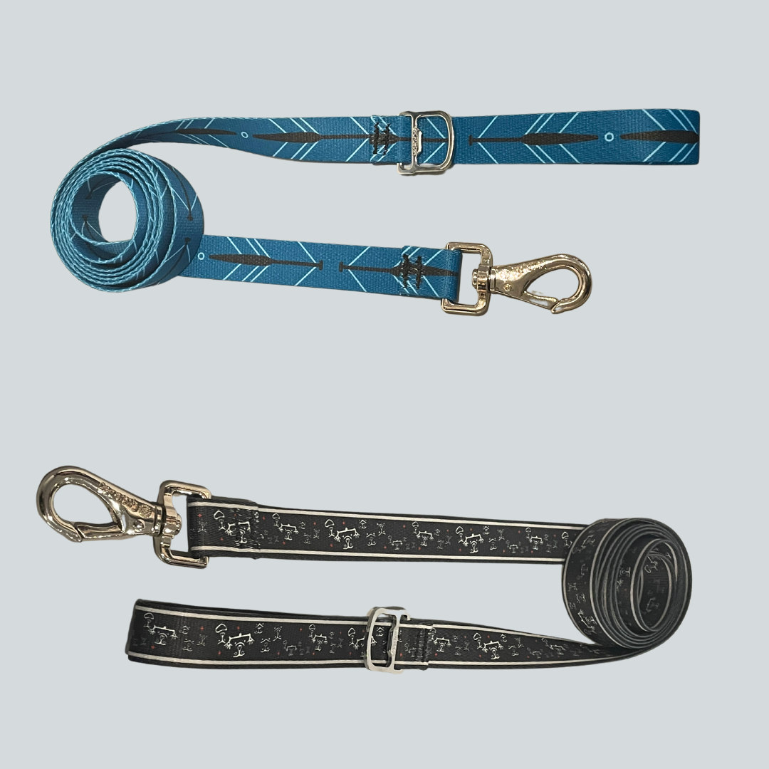 The perfect gift for any dog owner in your life. These dog leashes are 6' long and soft to the touch. The black leash has the petroglyph design while the blue leash has the unique paddle design. For added convince, there is a bottle opener near the handle.
