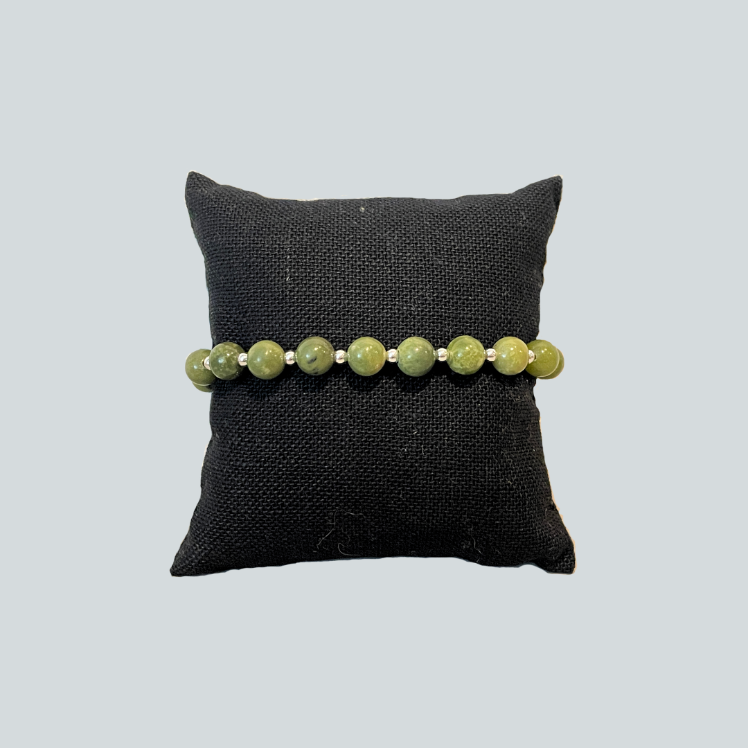 This bracelet was made by Aluttiq Seal Artist June Pardue. Approximately 7.75" long, the jade feels cold and smooth against the skin. With the clasp, this piece of jewelry will stay secure on your wrist.