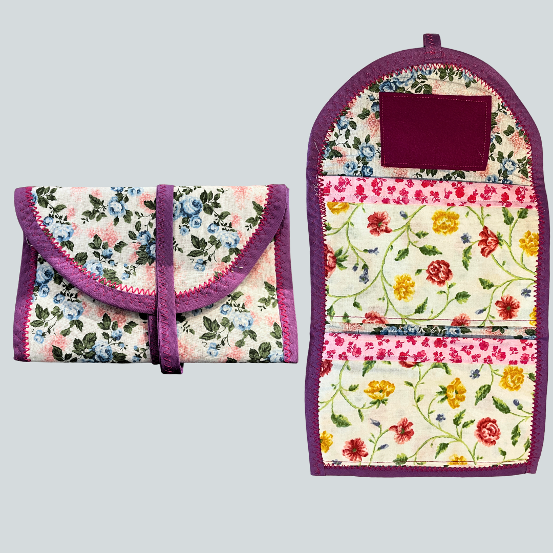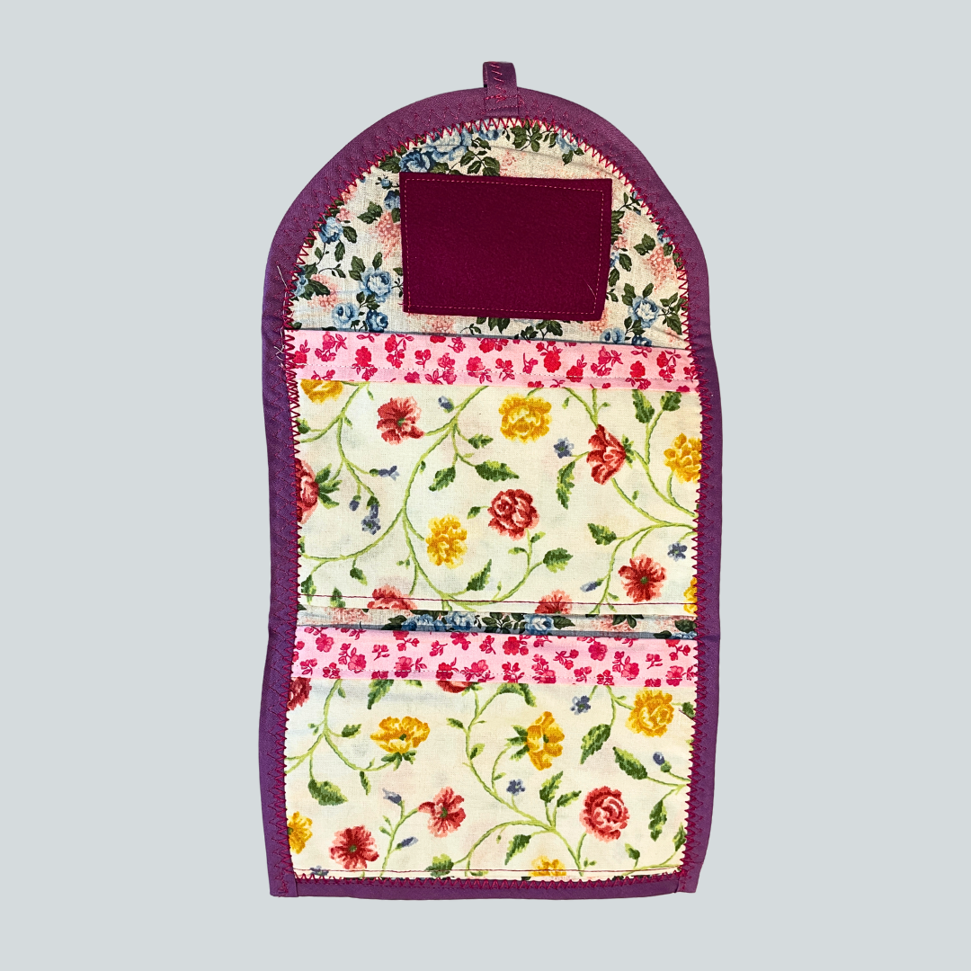 This sewing bag was made by Alutiiq Seal Artist June Pardue. With two wide pockets on the inside, you will have enough space to hold all of your sewing equipment. The cloth material is soft to the touch. The pockets are approximately 7.25" wide by 4.75" tall. With the tie going around the bag, you'll be able to assure that everything remains secure.