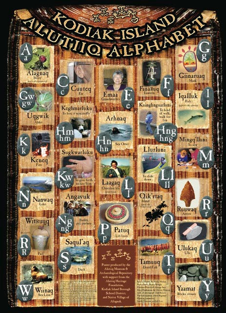 The Alutiiq alphabet has 26 letters, just like the English alphabet, but letters in these two languages do not always make the same sounds. The Kodiak Island Alutiiq Alphabet poster (18" x 24") shows the sounds of the Alutiiq language from A - Alagnaq (berry) to Y - Yamat (rock), allowing language learners to visualize and practice the smallest parts of Alutiiq speech. An example word and colorful picture from the Alutiiq world illustrate each sound. Produced by the Alutiiq Museum with assistance from the Kodiak Island Borough School District. Second Edition. This poster can be purchased as a set with the Alutiiq Numbers poster. Posters are mailed in a special poster tube. Mailing cannot be combined with other items. **Please note that due to being shipped in a tube, the shipping cost for this item is currently $26.00