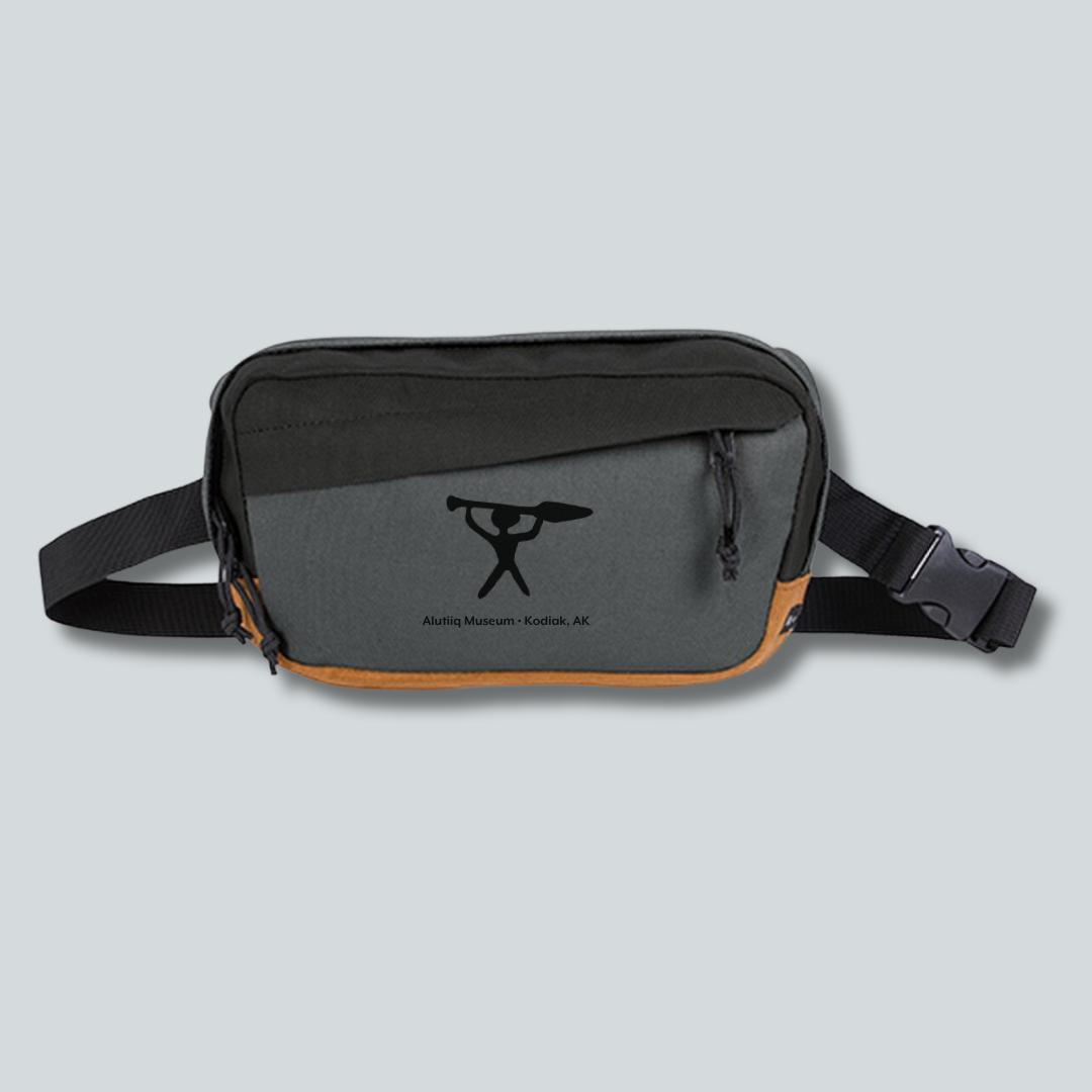 These fanny packs are made from recycled materials and comes with an adjustable strap to fit everyone just right. Perfect to carry your essentials and keep them in an easy to reach place. The Kayak man pictograph means "I go by sea" and was shared in the 1890s by Alutiiq linguist Vladimir Naumov.