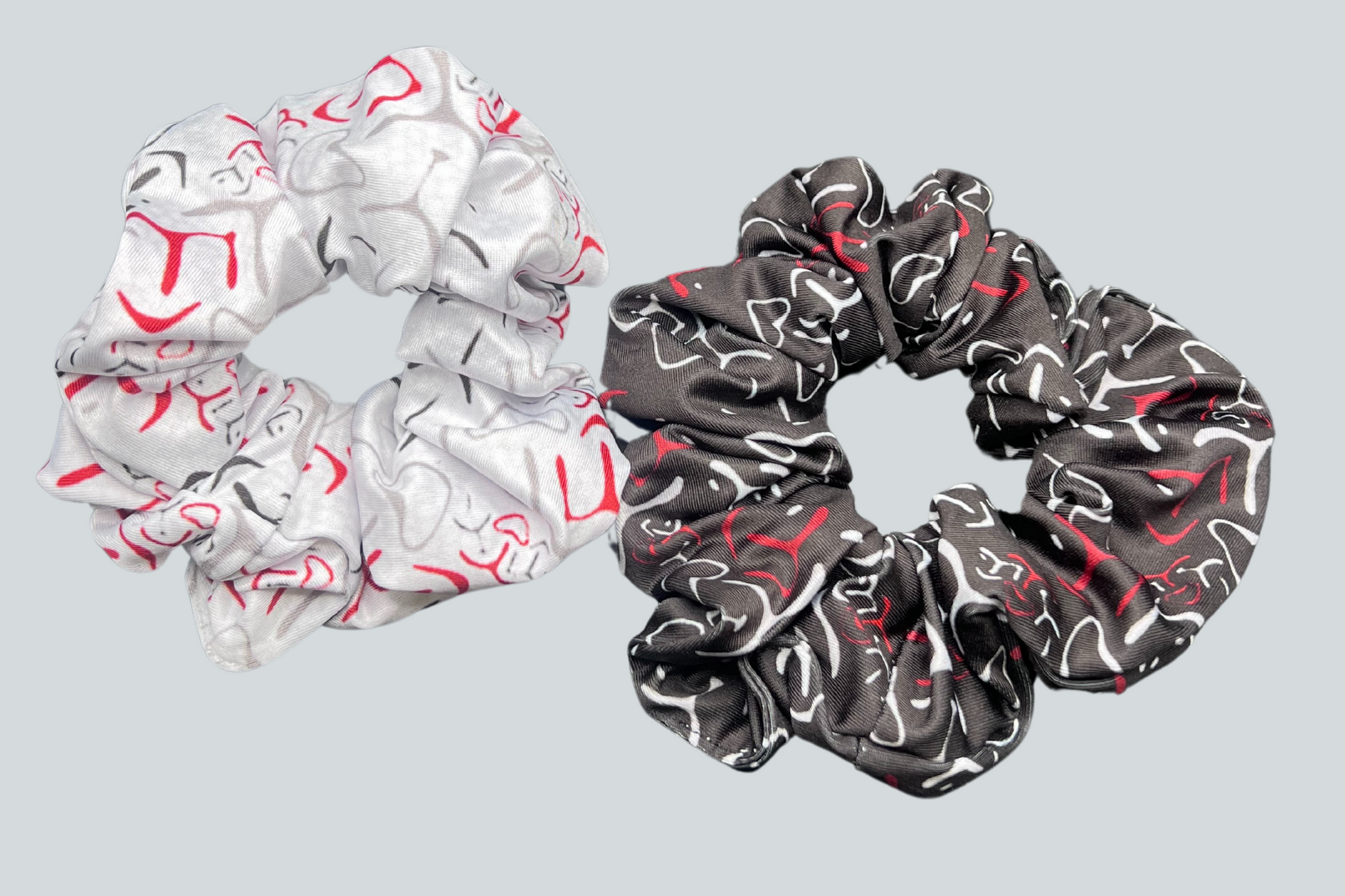 Petroglyph scrunchies made with 88% Polyester and 12% Spandex blend, mid-weight 4-way stretch fabric.
