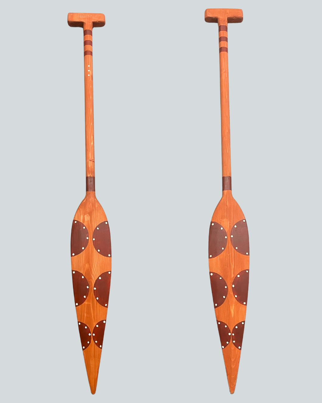 This paddle crafted by Patrick Lind is approximately 4' long. At the top, the handle is signed by the artist in gold colored ink. The warm toned wood is decorated with with geometric shapes, adding to the visual appeal. The paddle is decently lightweight, so it can be safely hung for display.