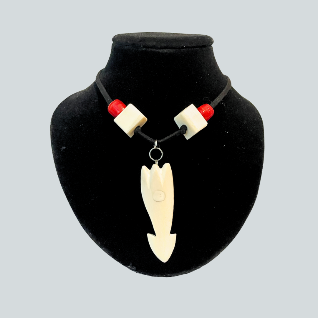 This charming necklace is made by Alutiiq Artist Alfred & Roberta Naumoff. Hanging 17" at the longest point, the ivory arrowhead is almost 2" long. Accented with red beads, this necklace is bound to be a showstopper.