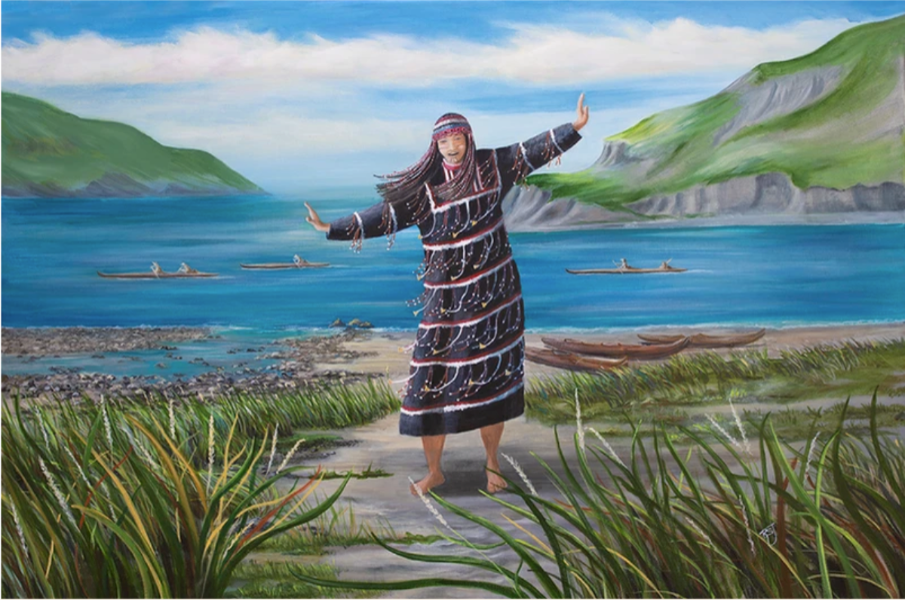 This painting features an Alutiiq Sugpiaq or Aleut/Unangan girl dancing in full regalia on the beach on a sunny day. Aluet and Alutiiq clothing was often made from puffin skins and feathers; they were reversible garments and required 40-60 puffins. These skilled artisans also used sea otter, seal, and other mammals to fashion their clothing. Dance was and still is an important part of Alaska Native culture.
