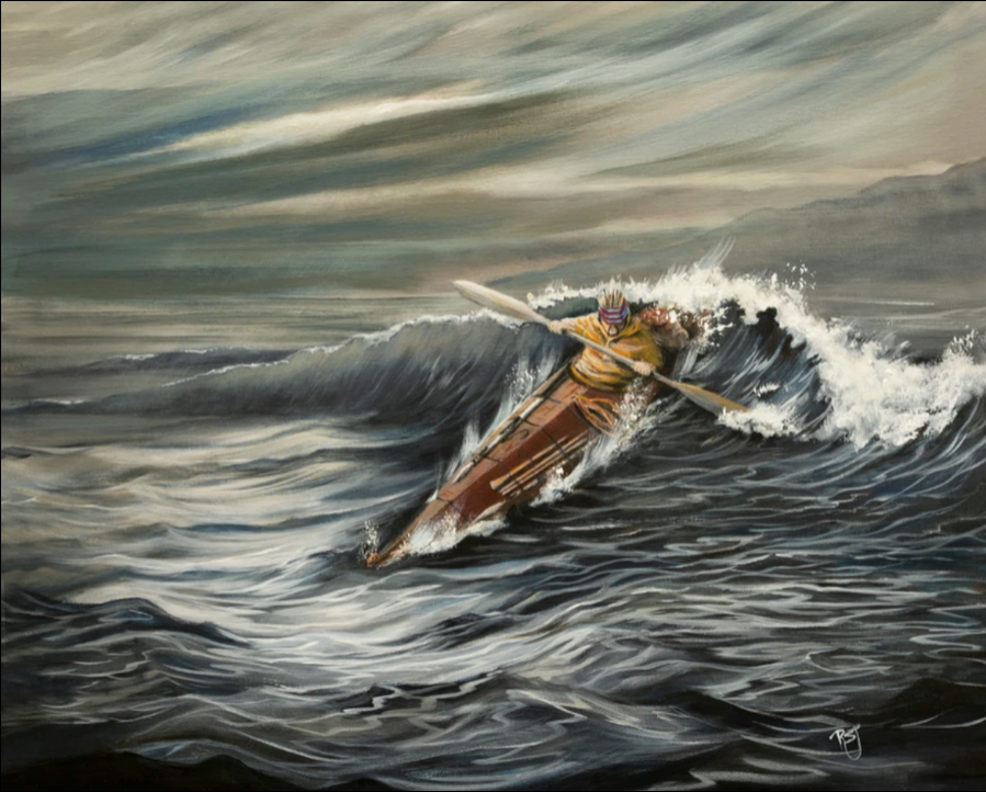 "The Hunter" Giclees print. Aleut or Alutiiq man paddles at sea. Created by Alaskan Native Artist Rhonda Shelford Jansen. Print size 5"x7" on a matted border. Archival quality giclee prints of original oil paintings, signed by artist Rhonda Shelford Jansen. Her paintings that are inspired by her years in Homer, Kodiak, and Dutch Harbor and her family's lineage in the Alaskan commercial fishing industry. Her Aleut (Unangan) heritage and her love for history are the foundation for her Native work. She specializes in oils, acrylic, and watercolor—creating soft, natural scenes with rugged coastlines, waves, and mountains.