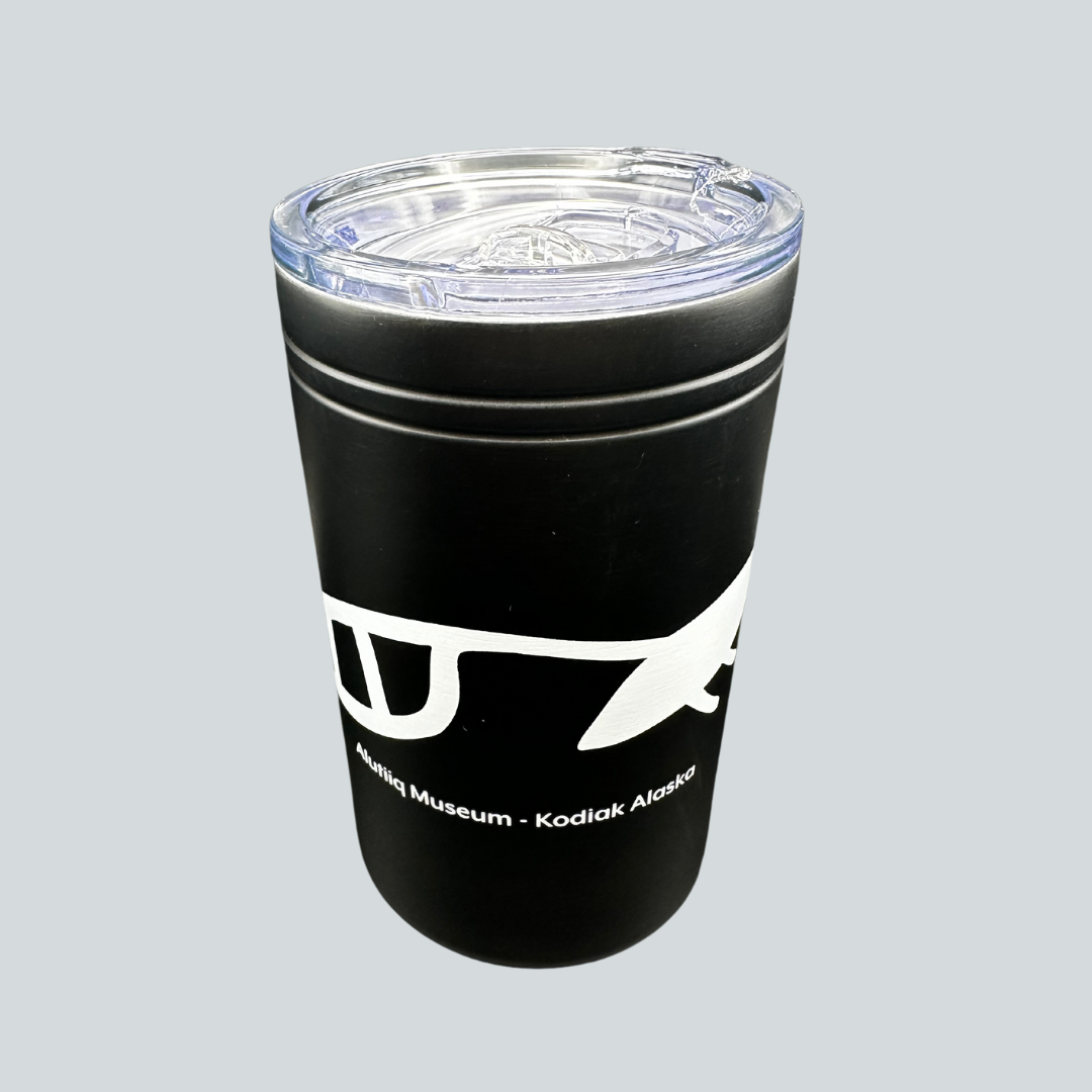 Insulated thermal coffee cup with image of a Alutiiq petroglyph we call sharing the catch. Available in grey, red, turquoise, black or blue.