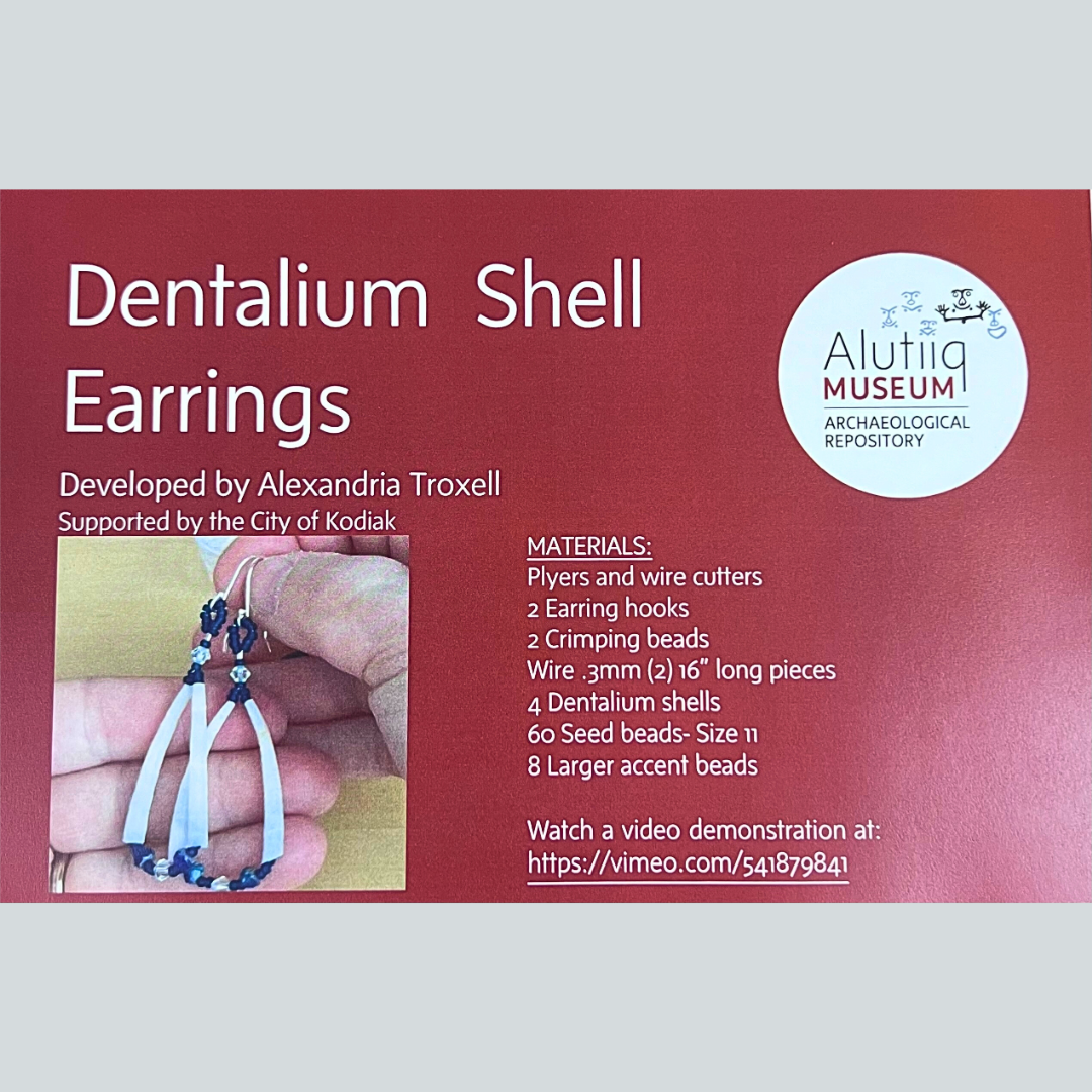 Everything you need to make your own Alutiiq-style dentalium earrings. Kit comes with beads, dentalium shells, earring wire, crimp beads, and earring hooks & backs. Bead colors vary. Step by step instructions included. A perfect gift for a budding beader to help them learn how to make a simple pair of earrings.