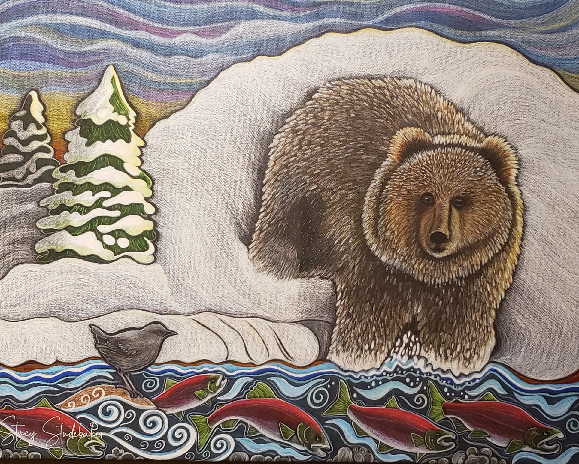 This canvas painting shows a bear cub down at the river hunting for some salmon accompanied by a friend who has the same idea. Painting is made by Kodiak artist Stacy Studebaker**Please note that the shipping cost for this item is currently $46.00