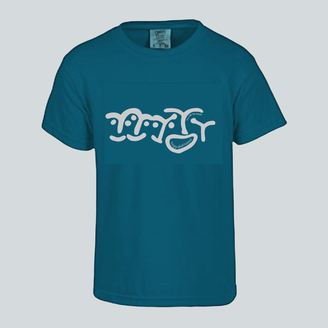 Yugpakartuten! You talk to much! Teal shirt with silver text. 100% ring-spun cotton shirt soft washed and garment dyed for added softness. Classic cotton youth tee features a crewneck and short sleeves. Double-needle stitching on the neck, sleeves and hem provide added durability. Unisex sizes.
